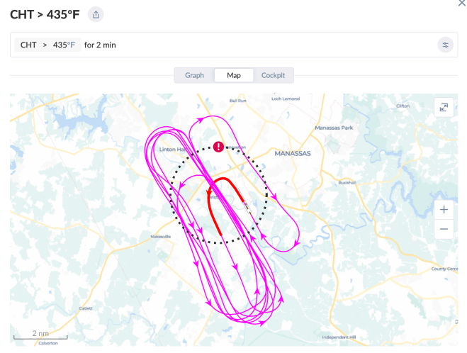 The flight track map tells the same story geographically — you can see the red segment (CHT > 435°F) concentrated right over the departure end of the runway, fading as we worked through our planned pattern to the southwest of the airport.