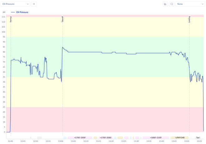 Oil pressure was equally well-behaved. It jumped to around 70 psi immediately at startup, showed some normal variability during taxi at idle power, then spiked cleanly to ~85 psi as full power was applied for takeoff. From there it held a steady ~80 psi through the entire flight — solidly in the green band — before settling back down during the taxi in after landing. On a brand new engine, seeing oil pressure that stable and consistent is exactly what you want.