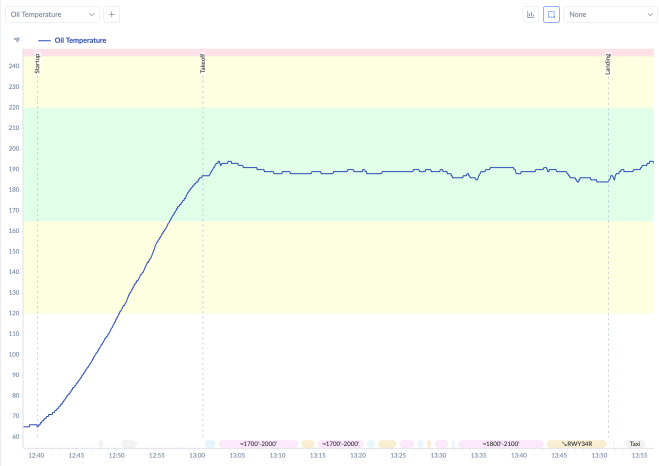Oil temperature started around 65°F at engine start, climbed steadily through the long taxi, reached roughly 185–190°F by the time we lifted off, peaked at around 195°F shortly after takeoff, then settled into a rock-solid band of 185–195°F for the entire flight — squarely in the green, never threatening the yellow or red zones. Whatever the CHTs were doing, the oil temperature was happy throughout.